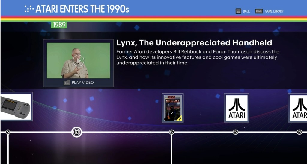 After playing Atari 50: The Anniversary Celebration now for two days, I can honestly say that this is no ‘compilation’ like any you’ve seen. In fact, Digital Eclipse have gone out of their way to label this “The Anniversary Celebration.” Nowhere in that naming is the words ‘collection’ or ‘compilation.’ That’s because this game is so much more than a compilation or collection could EVER be; in fact, this game is just like walking through an Atari museum and each game is represented like the works of art that they deserve to be. Stephen Frost was right, you really CAN go anywhere you like on Atari’s 50-year timeline of highs and lows. Atari 50 has literally made my expectations about ‘what a compilation or collection of games should be’ end up completely redefined. The game opens up on the timeline, where you can choose to go into the long and glorious Arcade years, or you can jump into the Birth of the 2600 Console, or beyond to other lesser-known forays into gaming. Of course, there is also content about the Lynx and Jaguar systems, which have never been commercially emulated before, in such special and specific ways. (As an aside, Digital Eclipse made brand new emulators for Lynx and Jaguar games, which they own, and Stephen Frost indicated to me that they are willing to work with Atari again should the prospect ever arise and both parties are in agreement. The emulators work wonderfully.) There are videos and factoids interlaced throughout, alongside pictures, ephemera, console information, manuals, secret ‘Atari handshakes,’ other videos, interviews with Atari programmers, developers and other Atari aficionados from over the years, and more. The collection contains about 103 Atari games, ranging from 1978’s 3-D Tic-Tac-Toe for the 2600, ending with Yoomp! from the Atari 800 computer, and highlighting everything in between like Picassos or Rembrandts in a vintage gaming museum, unlike anything you’ve ever seen before. (Trust me on that.)