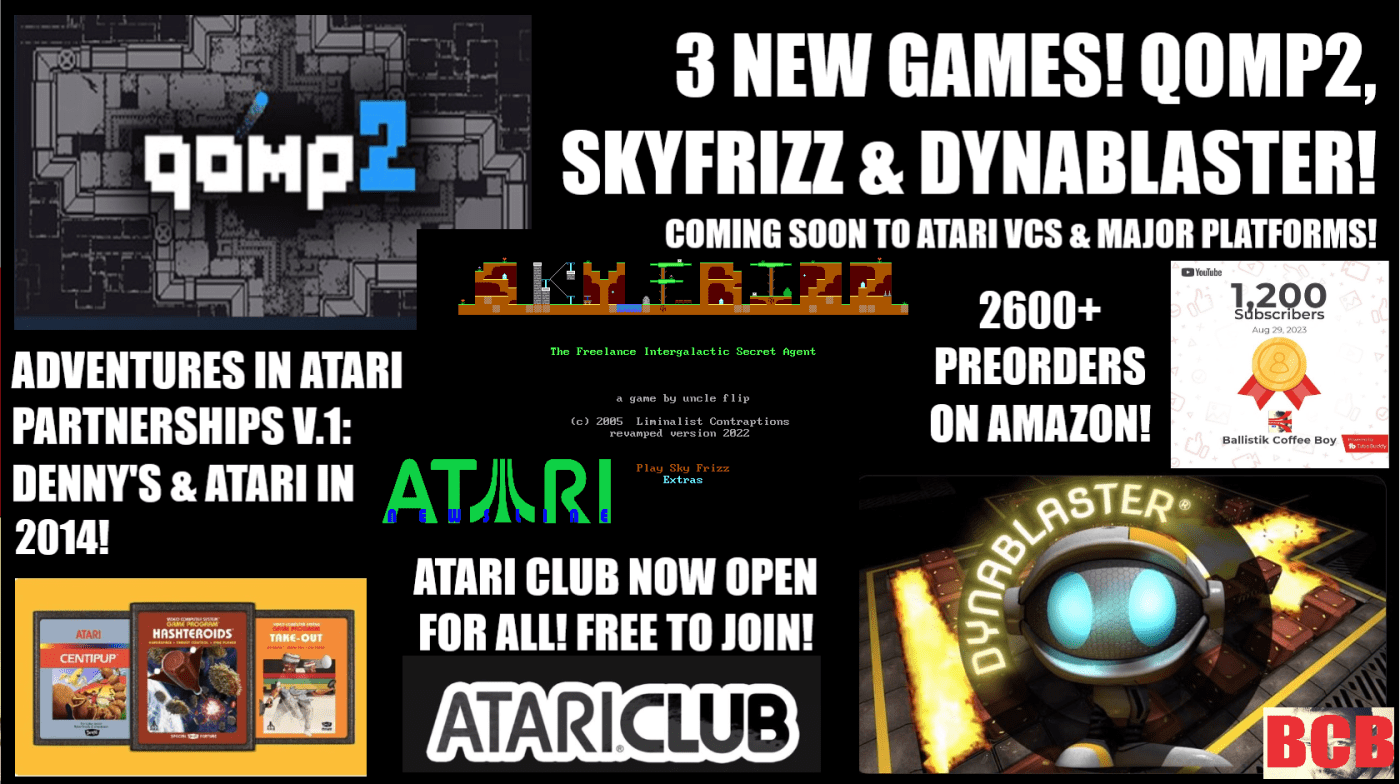 ATARI NEWSLINE. BREAKING NEWS. // On this action-packed episode of #AtariNewsline, 3 New #Games Were Announced in the past week! #Qomp2, #Skyfrizz & #Dynablaster! Let’s see those #promos! #AtariClub is NOW OPEN for ALL & It’s FREE! #2600Plus Up for #preorder on #Amazon! @IntoTheVerticalBlank Episode! A new feature… Adventures in #Atari #Partnerships! V.1: @dennys & @atari in 2016! And, finally, I hit 1200 #Subscribers!! A HUGE Thank You!