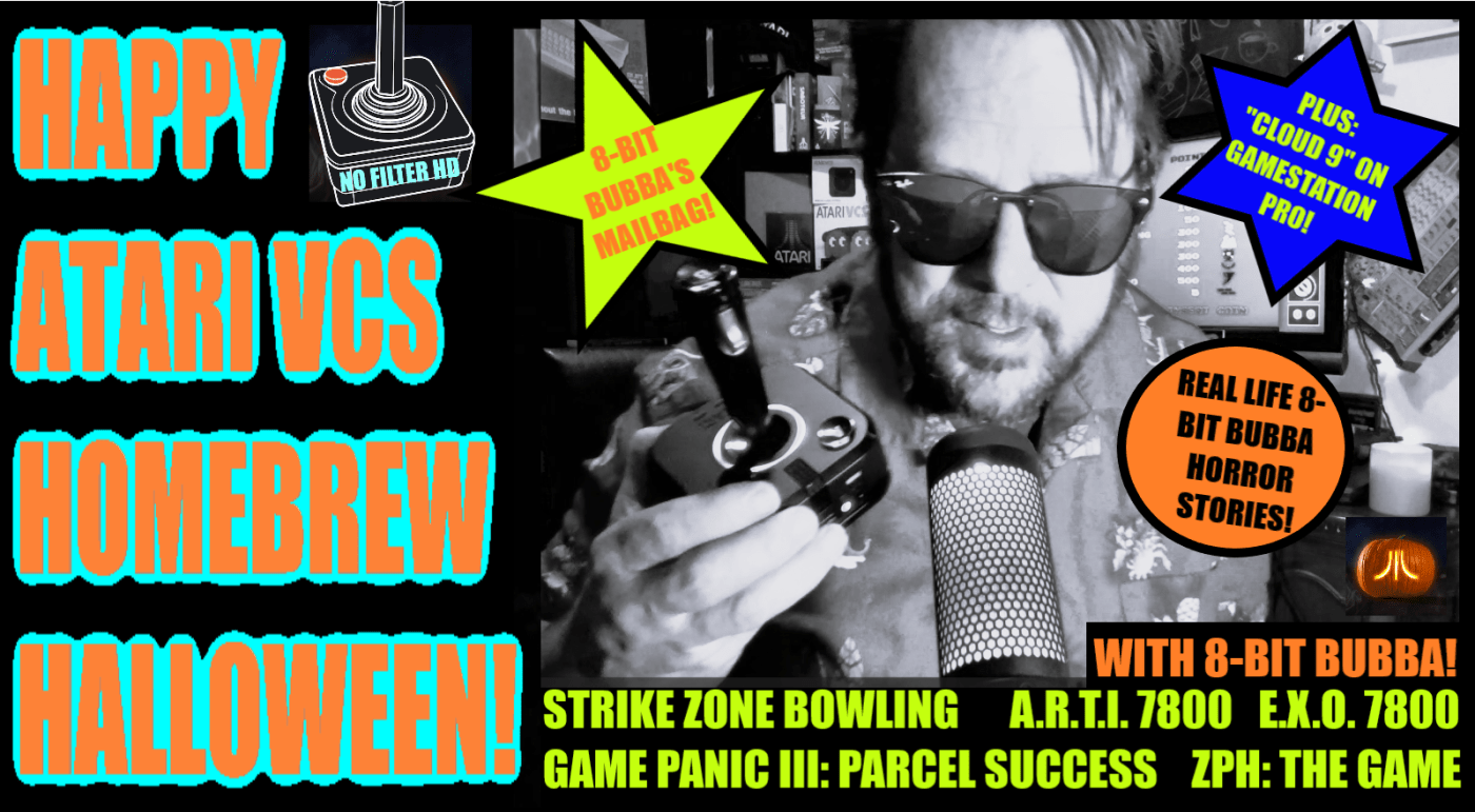 On this old-skool episode of #NoFilter, #8bitbubba is back! He’s here to cause general social mischief & play 5 new #homebrew #games on the #atarivcs! These are: #StrikeZoneBowling, #ARTI 7800, #GamePanic3 #ParcelSuccess, #ZPHTheGame, & #EXO 7800! Bubba also plays #Cloud9 on the #Atari #GamestationPro by #MyArcade! To top things off, he tells 2 real-life #horror stories (both coincidentally involving ex-wives!) and, yes, even a dose of 8-Bit Bubba’s “Howl-O-Ween Edition!” Oh boy. It’s a surefire mess you don’t wanna miss, with some cool games to boot!