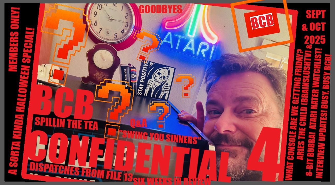 WELCOME TO BCB CONFIDENTIAL! The (semi, apparently!) monthly MEMBERS ONLY video to BCB Coffee Club Members! In episode 4, I discuss the past (uhem!) 6 weeks’ or more worth of videos, podcasts & more! From the Gamestation Go by My Arcade to the upcoming announcement on October 17th @ PRGE in Portland, I discuss the latest tea on Atari & unsubstantiated gossip & more. Ok. So I’ve heard some stuff since July. I talk about what I’ve seen & we see if it matches up on Friday. AND: 6 weeks worth of content! 42 videos & 2 podcats! A gallery in BCB’s sub-par thumbnails! PLUS: ‘Swing You Sinners,’ a 1930 Creepy-AF Halloween cartoon! My Dad wasn’t even alive when this came out, my grandmother was like 9 or something. WOW. Anyhow, enjoy it! It’s fun! Plus: I show you a sneak peek at Aries the Child (@BrainSlushTV) as he appears on the upcoming Halloween episode of ‘That Atari Show’ for October 20th. And 8-Bit Bubba pops in! Also: Atari Loony Hater Watchlist, Intro from Bed (from my dining room arcade instead), interview updates, Tony Barnes, The Laird’s Lair, Tim Lapetino, and much more (hopefully) coming your way soon! And an update on ‘Digging in the Dirt,’ my documentary I hope to one day complete! Happy Halloween and have a great laid back chill holiday!