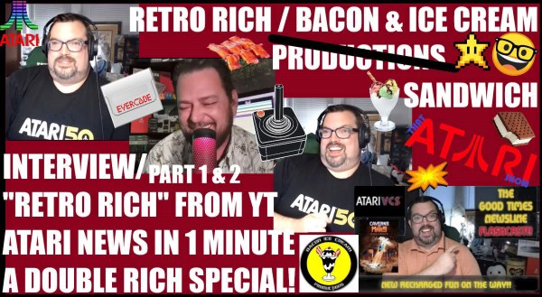 This episode, it's a Double Rich Special! Retro Rich Heywood with Bacon Ice Cream Productions on #YouTube joins us! In part 1, we learn about Rich's channel, his Alzheimer's Walk cause & the #Evercade/Funstock delays. In part 2, Rich digs up a breaking news story (at the time), shares it with me, and it's the coolest. #CavernsofMars; Recharged news breaks. It's an amazing moment. Also: #Atari News in under 1 Minute! Can I do it? Watch and find out. ๐